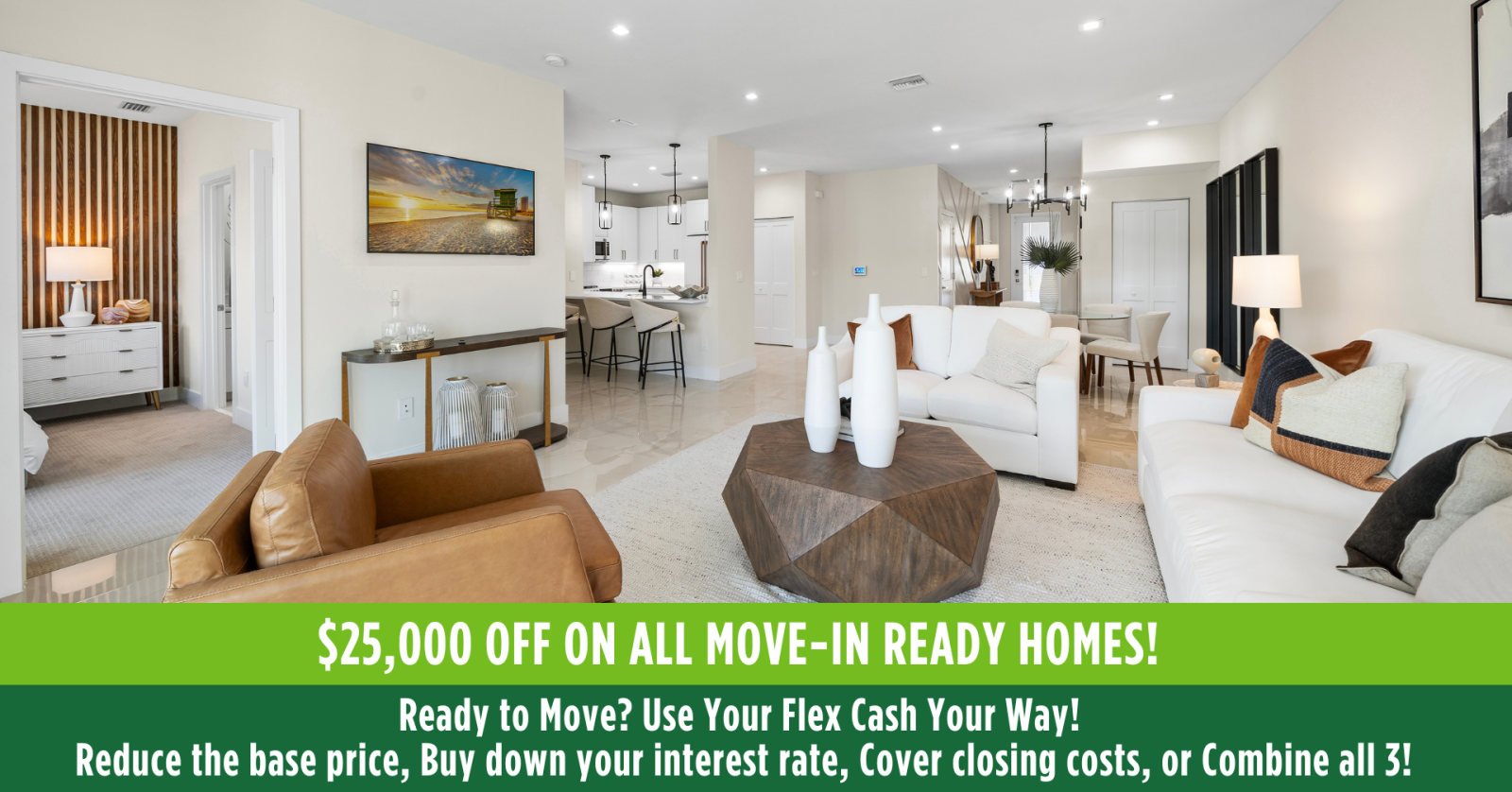 Use your Flex Cash your way: Reduce the base price, Buy down your interest rate, Cover closing costs, or Combine all 3!* (*Builder incentive applies to contracts signed by September 30, 2025.)