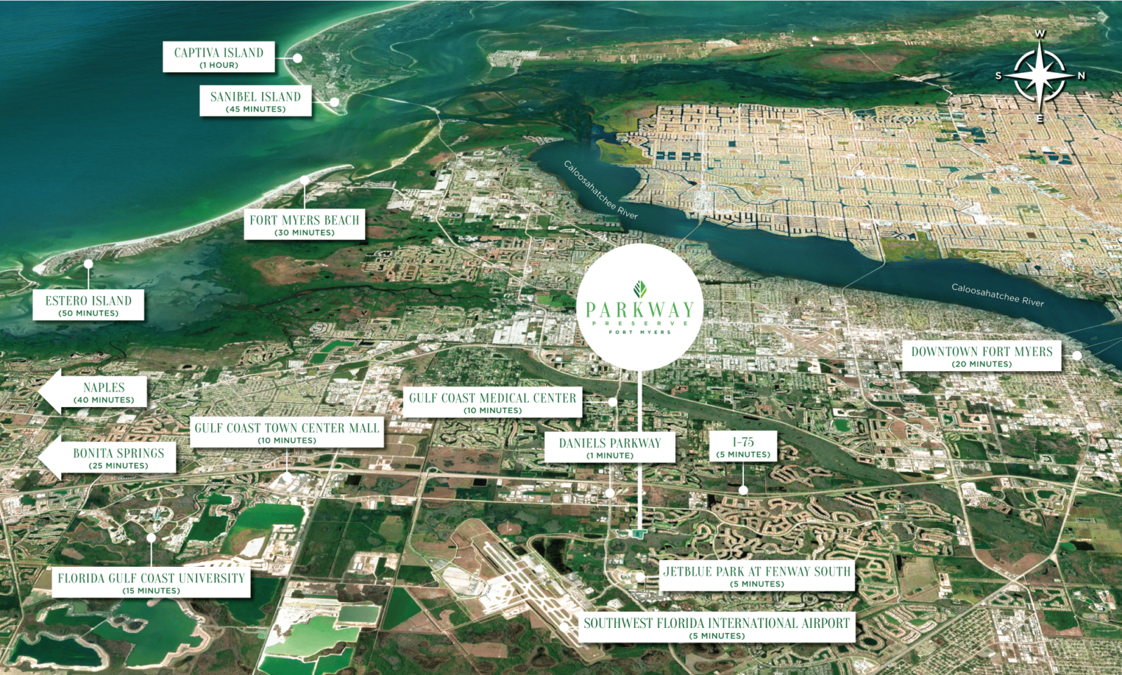 There is so much to explore beyond the gates of Parkway Preserve. Travel with ease in and out of Southwest Florida International Airport, catch a Boston Red Sox spring training game at JetBlue Park, shop and dine in Downtown Fort Myers or Gulf Coast Town Center Mall and lay in the sand and cool off in the Gulf of Mexico at Fort Myers Beach or Sanibel and Captiva Islands.